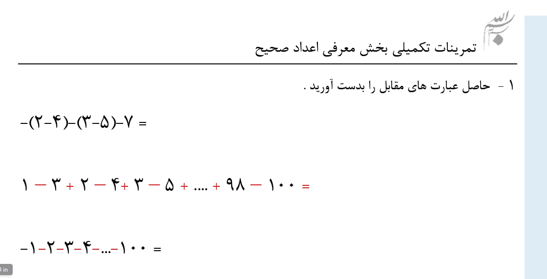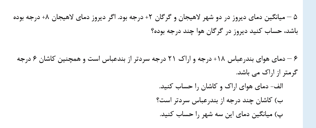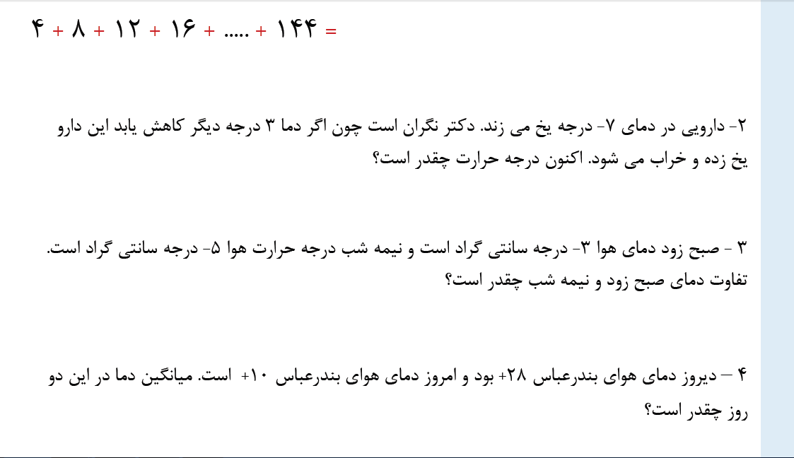 سئوالات تکمیلی مربوط به جمع و تفریق اعداد صحیح