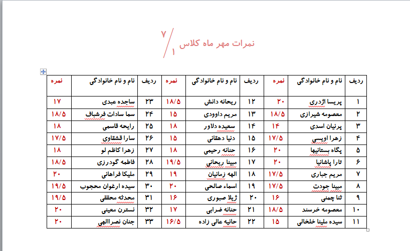 نمرات مهر ماه