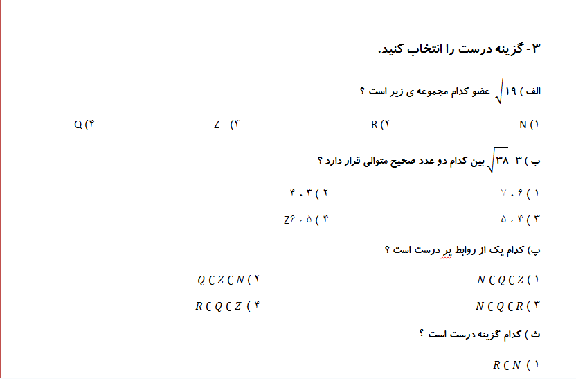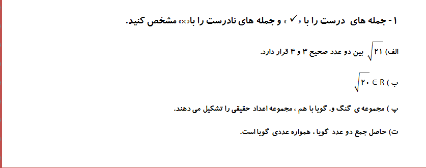 مجموعهی اعداد گویا و اعداد اصم (گنگ) را اعداد حقیقی مینامند. همهی اعدادی که تا کنون با آنها آشنا شدهاید جزء اعداد حقیقی هستند. مثال: در