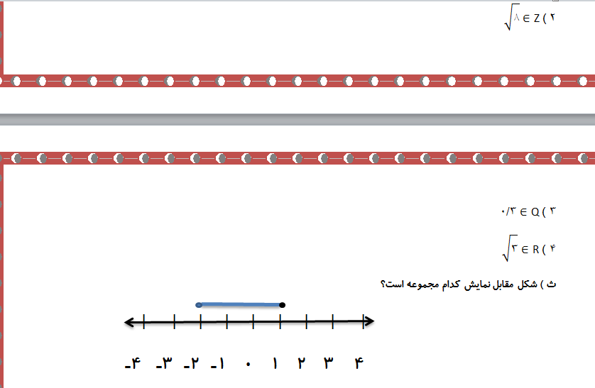روی محور اعداد این مجموعه همه نقاط روی محور را که بزرگتر از 5 باشند را شامل میشود ولی 5 نه، 5 عضو این مجموعه نیست: نکته: خط سیاه، همه اعداد عضو مجموعه A را نشان میدهد. فلشی که در سمت راست قرار دارد، نشان دهندهی نامتناهی بودن مجموعه است. نکته: دایره توخالی در سمت چپ نیم خط نشان میدهد که 5 عضو این مجموعه نیست. اگر 5 عضو این مجموعه بود باید دایره را توپر میکشیدیم. مثال: مجموعهی